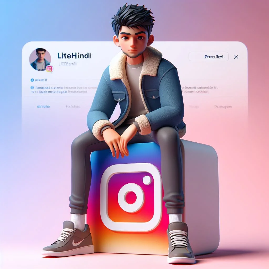 Create a 3D illustration of an animated charactersitting casually on top of a social media logo'instagram". The character must wear casualmodern clothing such as jeans jacket andsneakers shoes. The background of the imageis a social media profile page with a user name"litehindi" and a profile picture that match