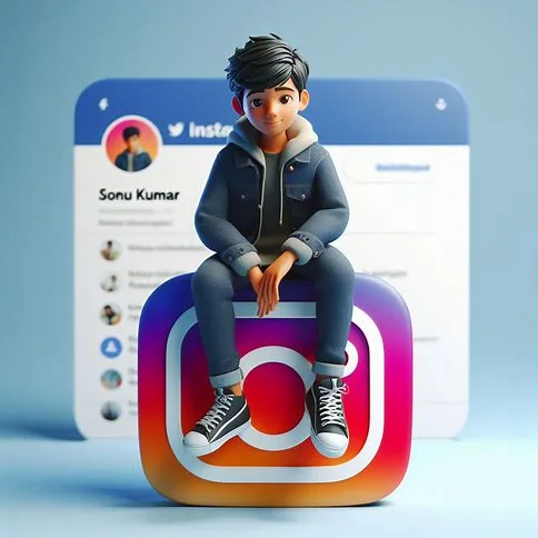 Cation-Create a 3D illustration of an animated character sitting casually on top of a social media logo "Instagram". The character must wear casual modern clothing such as jeans jacket and sneakers shoes. The background of the image is a social media profile page with a user name "sonu kumar" and a profile picture that match.