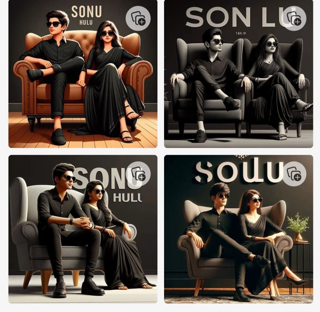 Create a 3D illustration for a profile picture of an 18-year-old couple sitting comfortably in a wing chair. The boy is wearing a black shirt pants and sunglasses, and the girl is wearing a black saree and sunglasses. He is looking ahead. "Sonu" and "Hulu" are written in large font on the black wall in the background.