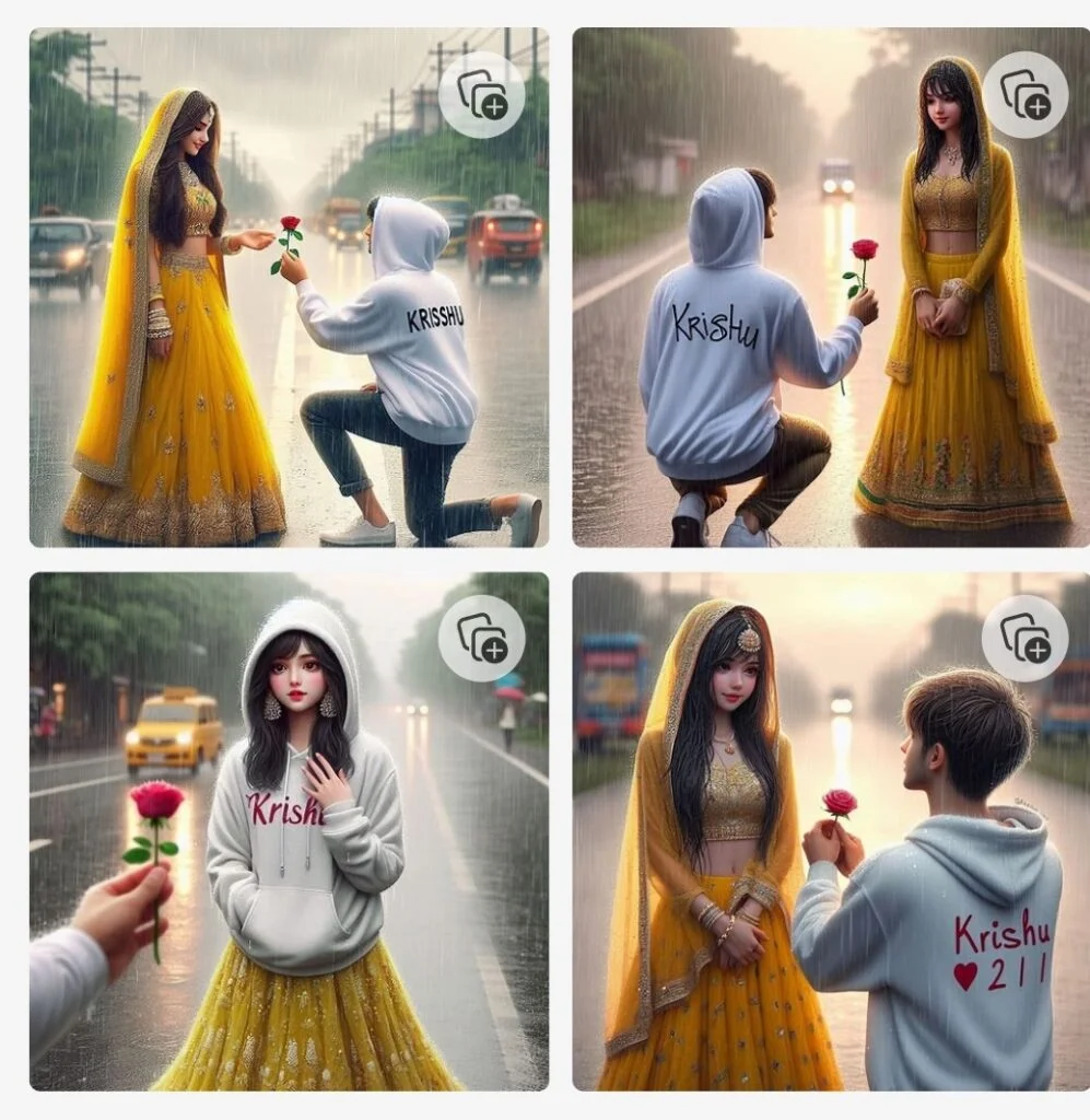 Realistic indian 21 year old cute boy proposing on with 16 year beautiful girl in Yellow lehenga the road with an and a red rose flower on, wearing a white hoodie with name " Krishu " write on Hooodie, After rain and no boys, beautiful lonely picture, pretty girl staning in the rain, so happy picture, profile pic, rainy weather, beautiful realistic photo, ultra realistic picture, rainy day, very beautiful photo, hyperealistic photo, it is raining