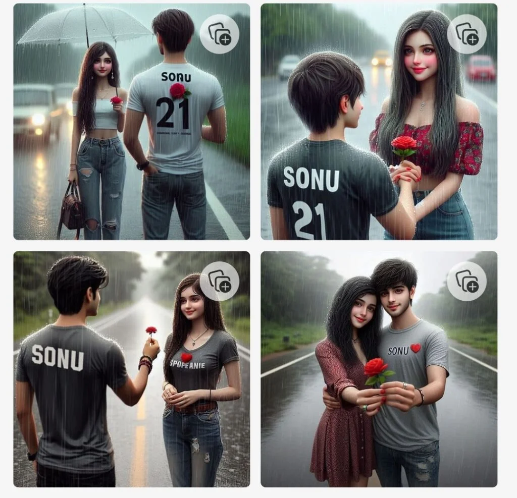 Realistic indian 21 Year old cute boy proposing on with 16 year beautiful girl in Casual dress the road with an and a red flower on, Wearing a full t shirt write name " Sonu " on boy t shirt, After rain and no boys, Beautiful lonely picture, pretty girl standing in the rain, So happy picture, profile pic, rainy weather, beautiful realistic photo, ultra realistic picturre, rainy day, very beautiful photo, hyperealistic photo, it is raining.